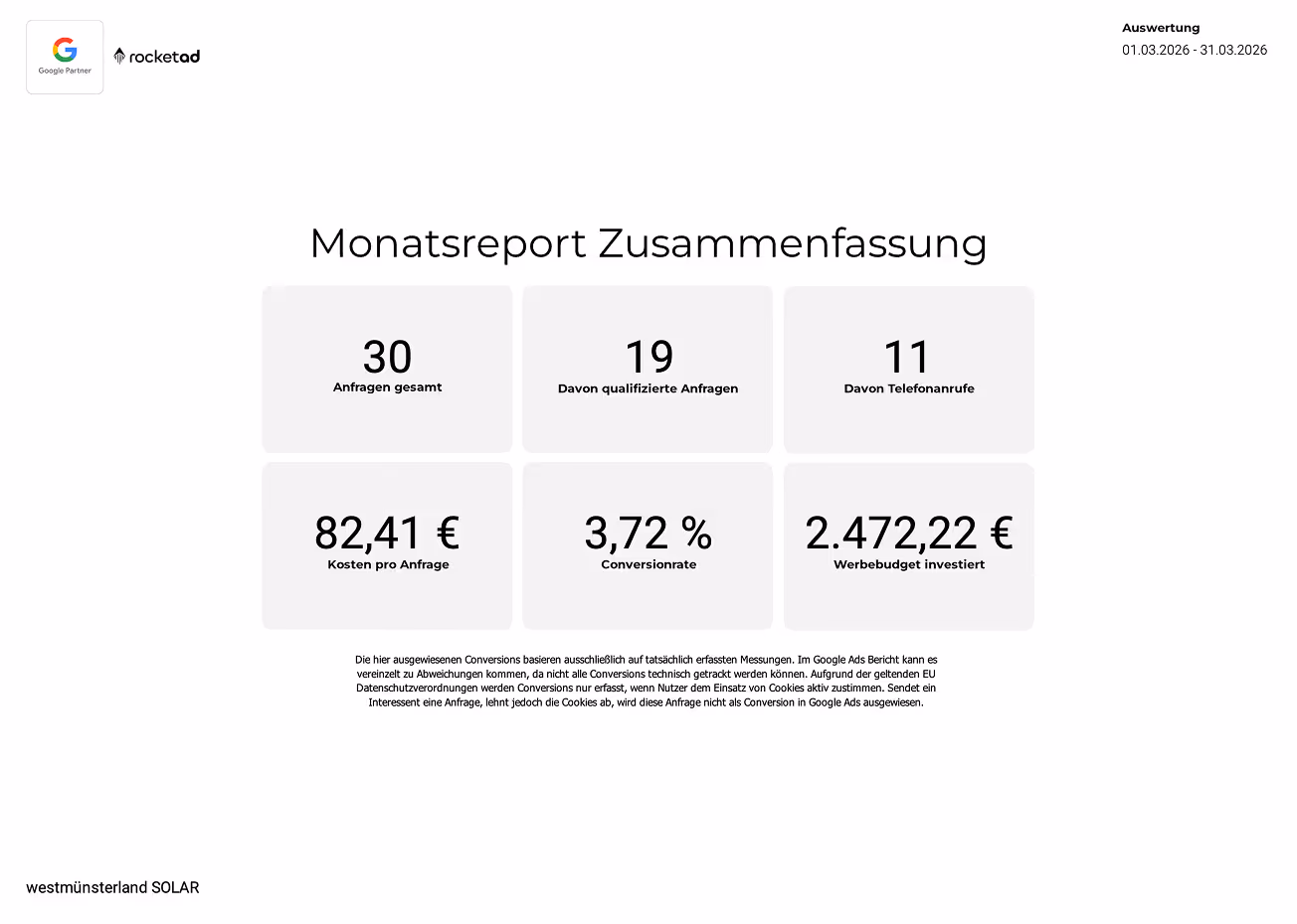 Bereits kurz nach dem Go-live kamen kontinuierlich qualifizierte Anfragen direkt über Google Ads. Kein Zufall mehr, keine Leadportale – sondern planbare Nachfrage, die exakt zur Arbeitsweise von westmünsterland SOLAR passt.